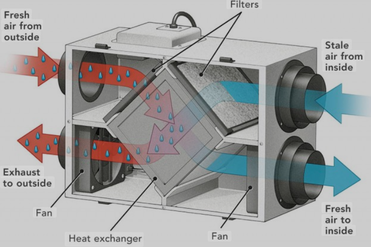 ERV systems are an integrated system to bring fresh air from outside into air ducts and extract stale air from inside and send it out. It seems simple enough, but the physics are quite extraordinary. The air passes through a series of filters to remove dust particles, and optionally de-humidify the air. Some systems add climate control into the mix as well, but this simple pumping system only requires a low level of power to run.